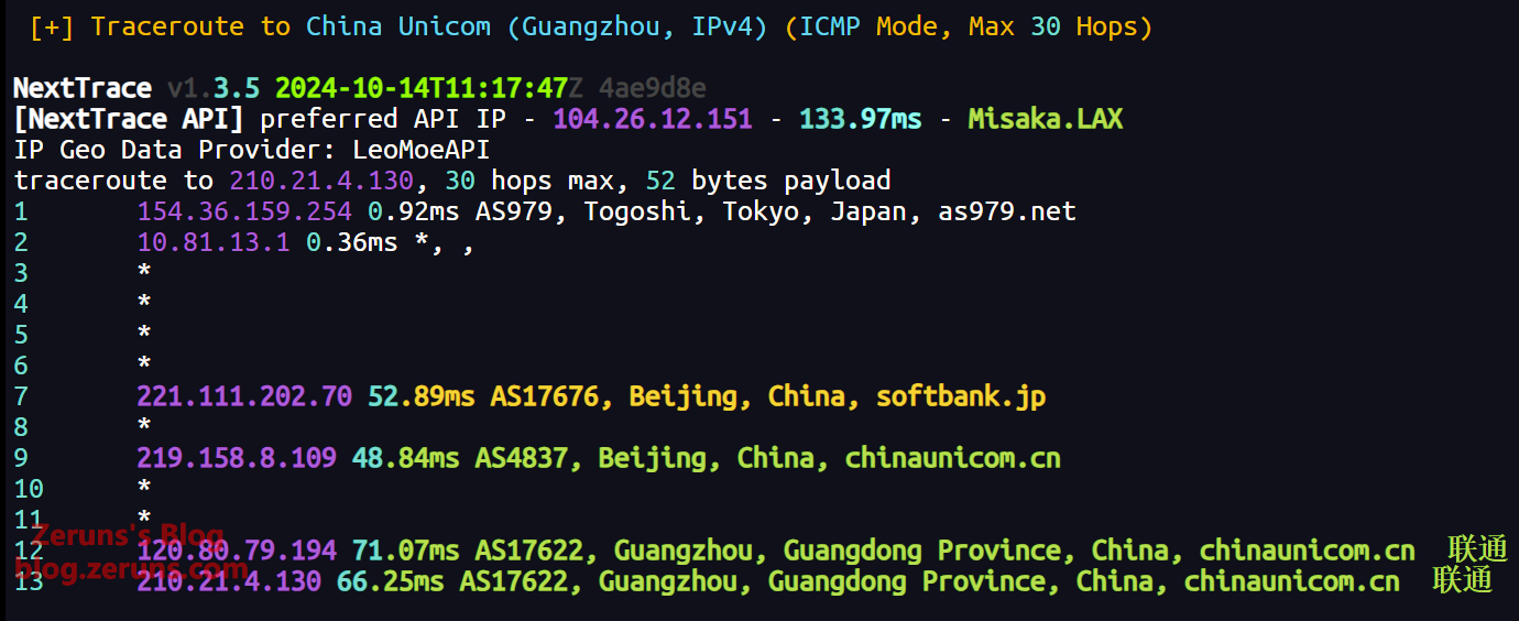 回程到广州移动,走移动CMI线路(AS9808)经香港回到境内。