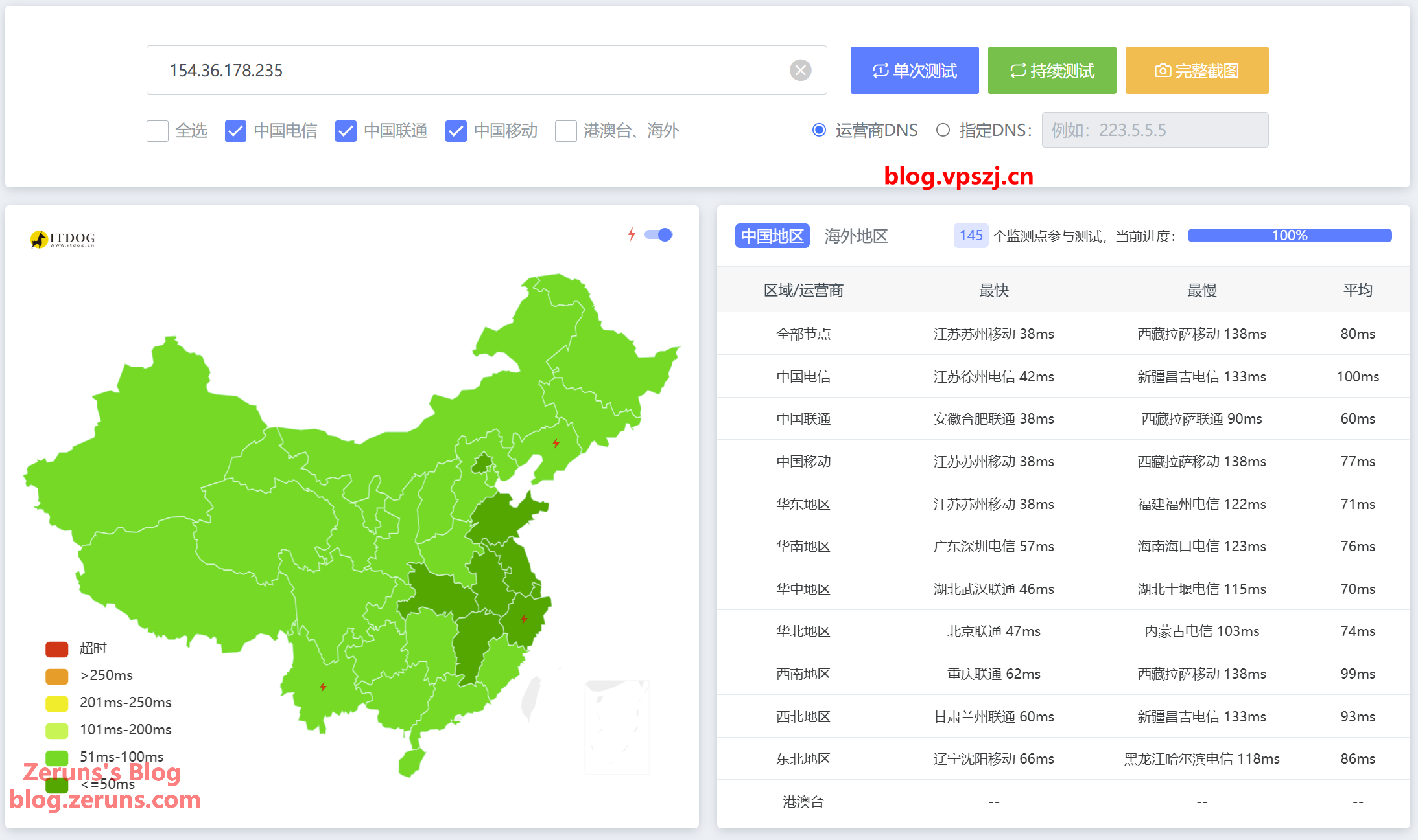 三网平均延迟 80ms,最快江苏苏州移动 38ms。