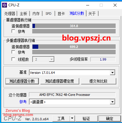 单核 351.8 分,多核 699.2 分,多线程倍率 1.99