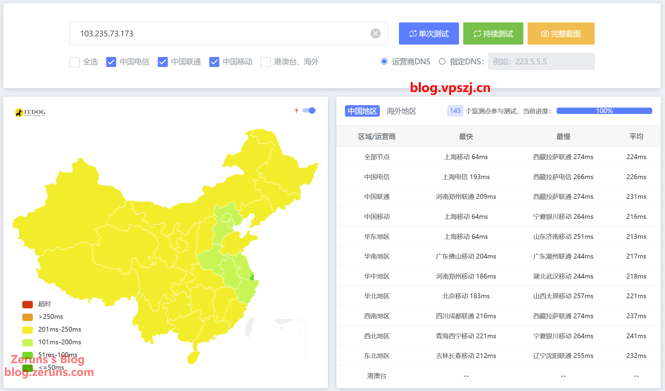 三网平均延迟 224ms,最快上海移动 64ms。