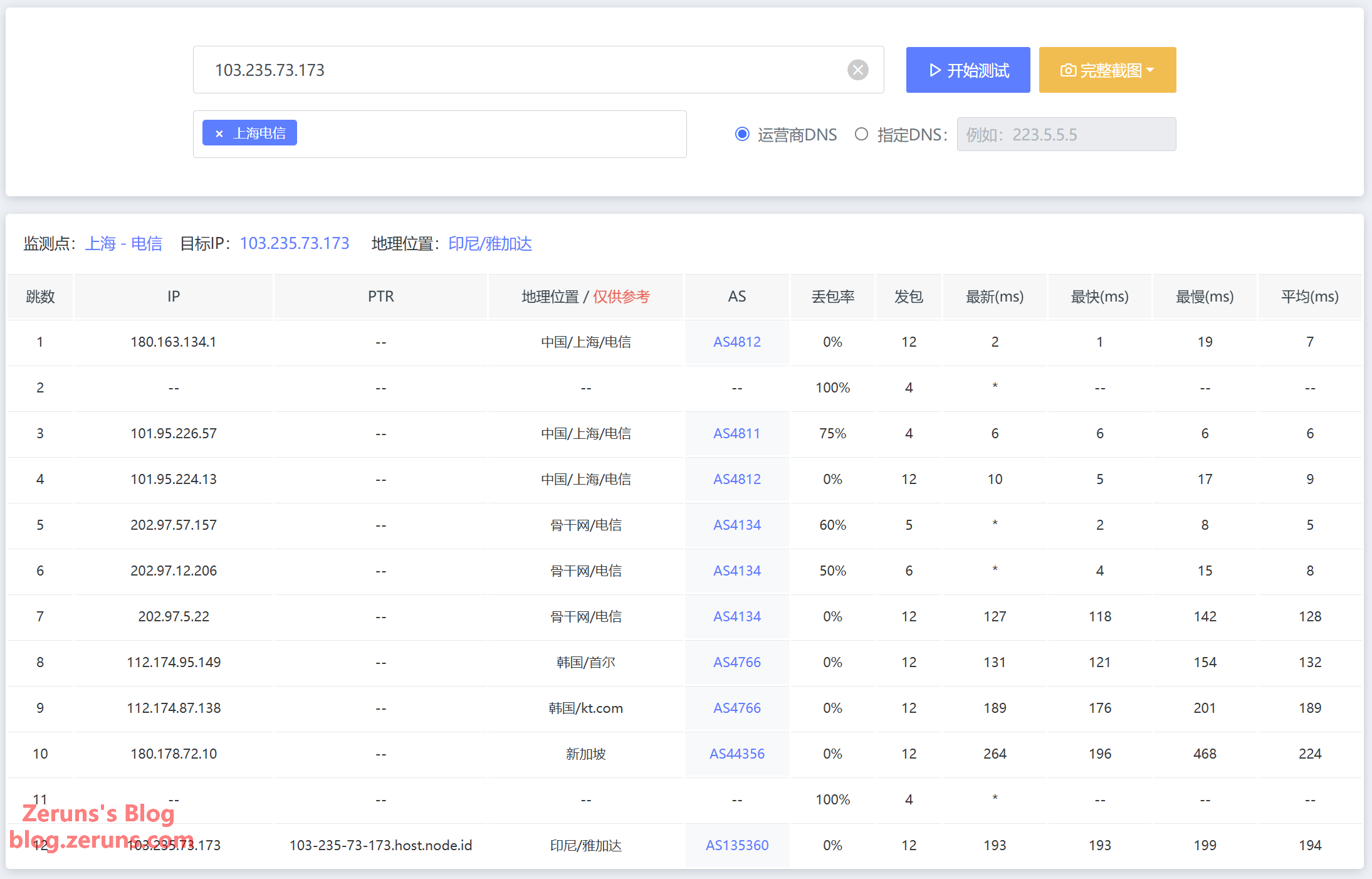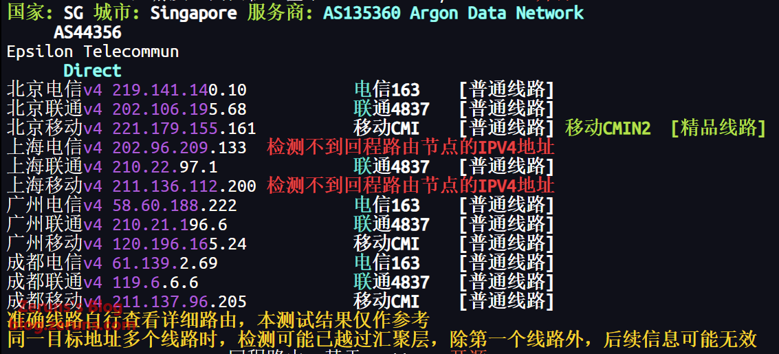 上海电信去程,走电信163线路(AS4134)绕路韩国到新加坡。(IP应该是广播IP,所以归属地信息不对)