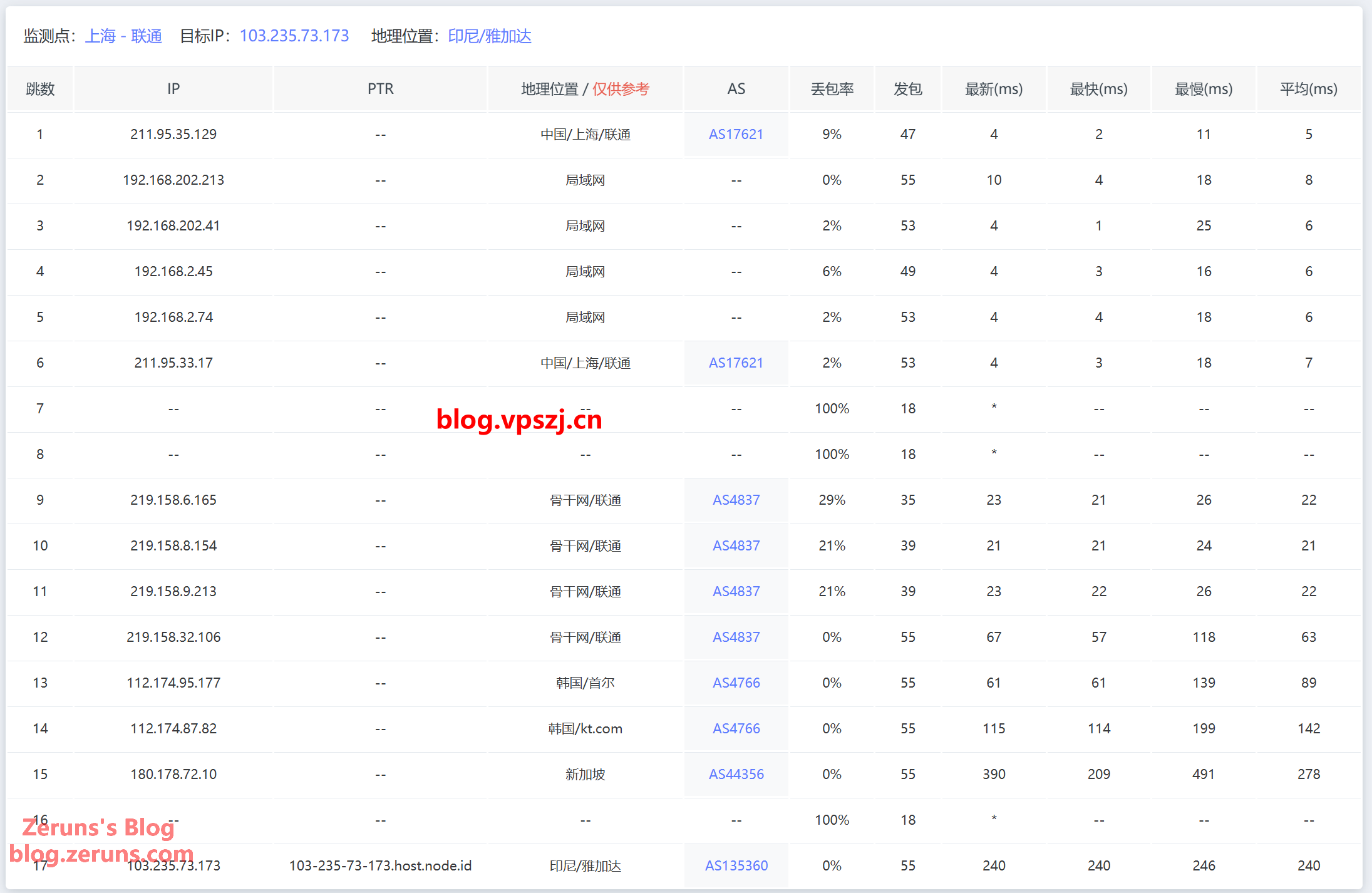 [+] Traceroute to China Unicom (Guangzhou, IPv4) (ICMP Mode, Max 30 Hops) NextTrace v1.3.5 2024-10-14T11:17:47Z 4ae9d8e [NextTrace API] preferred API IP - 104.26.12.151 - 223.81ms - Misaka.LAX IP Geo Data Provider: LeoMoeAPI traceroute to 210.21.4.130, 30 hops max, 52 bytes payload 1 10.0.0.1 0.30ms *, , 2 103.235.73.1 0.44ms AS135360, DKI Jakarta, Indonesia, argon.sg 3 172.18.2.85 59.11ms *, , 4 * 5 * 6 216.66.93.194 205.57ms AS6939, Frankfurt, Hessen, Germany, he.net 7 219.158.11.181 209.79ms AS4837, Guangzhou, Guangdong Province, China, chinaunicom.cn 联通 8 219.158.4.125 211.69ms AS4837, Guangzhou, Guangdong Province, China, chinaunicom.cn 联通 9 219.158.3.33 211.91ms AS4837, Guangzhou, Guangdong Province, China, chinaunicom.cn 联通 10 112.96.0.146 210.58ms AS17816, Guangzhou, Guangdong Province, China, chinaunicom.cn 联通 11 120.80.173.130 214.29ms AS17622, Guangzhou, Guangdong Province, China, chinaunicom.cn 12 210.21.4.130 211.14ms AS17622, Guangzhou, Guangdong Province, China, chinaunicom.cn 联通