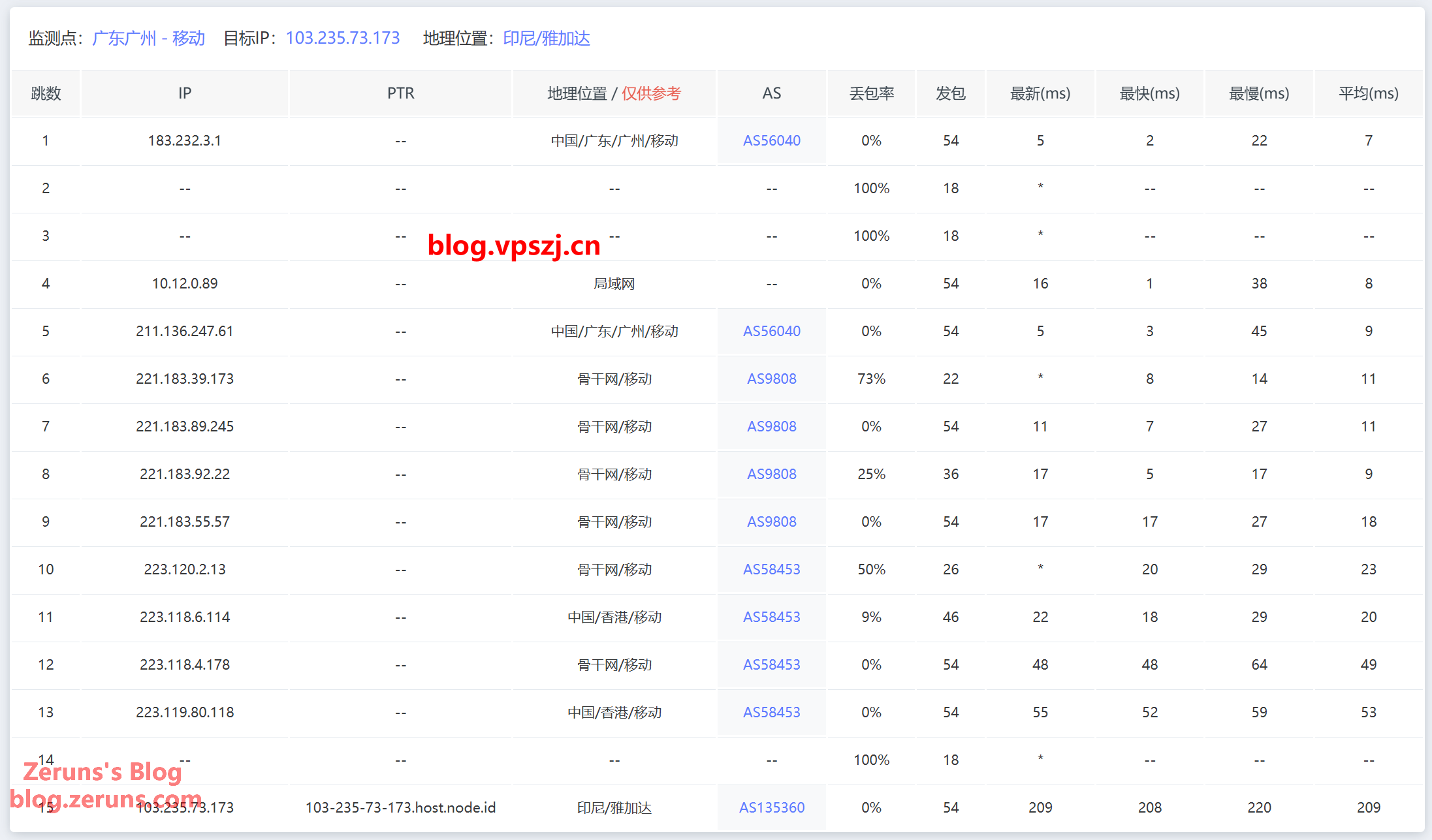 [+] Traceroute to China Mobile (Guangzhou, IPv4) (ICMP Mode, Max 30 Hops) NextTrace v1.3.5 2024-10-14T11:17:47Z 4ae9d8e [NextTrace API] preferred API IP - 172.67.69.163 - 220.02ms - Misaka.LAX IP Geo Data Provider: LeoMoeAPI traceroute to 183.232.48.167, 30 hops max, 52 bytes payload 1 10.0.0.1 0.25ms *, , 2 103.235.73.1 0.58ms AS135360, DKI Jakarta, Indonesia, argon.sg 3 * 4 * 5 184.104.189.52 150.19ms AS6939, Frankfurt, Hessen, Germany, he.net 6 * 7 80.81.195.121 158.81ms AS58453, Frankfurt, Hessen, Germany, cmi.chinamobile.com 8 * 9 223.120.16.254 196.30ms AS58453, Guangzhou, Guangdong Province, China, cmi.chinamobile.com 10 221.183.92.197 198.14ms AS9808, Guangzhou, Guangdong Province, China, chinamobileltd.com 移动 11 221.183.92.213 201.29ms AS9808, Guangzhou, Guangdong Province, China, chinamobileltd.com 移动 12 * 13 221.183.174.46 218.68ms AS9808, Guangzhou, Guangdong Province, China, chinamobileltd.com 14 120.196.254.114 207.56ms AS56040, Guangzhou, Guangdong Province, China, gd.10086.cn 移动 15 183.232.0.218 203.69ms AS56040, Guangzhou, Guangdong Province, China, gd.10086.cn 移动 16 * 17 183.232.48.167 205.26ms AS56040, Guangzhou, Guangdong Province, China, gd.10086.cn 移动