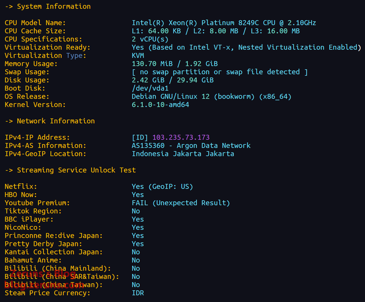 ------------流媒体解锁--基于oneclickvirt/CommonMediaTests开源----------- 以下测试的解锁地区是准确的,但是不是完整解锁的判断可能有误,这方面仅作参考使用 ----------------Netflix----------------- [IPV4] 您的出口IP完整解锁Netflix,支持非自制剧的观看 NF所识别的IP地域信息:印度尼西亚 [IPV6] 您的网络可能没有正常配置IPv6,或者没有IPv6网络接入 ----------------Youtube----------------- [IPV4] 连接方式: Youtube Video Server 视频缓存节点地域: 新加坡 新加坡/樟宜 (SIN11S18) [IPV6] Youtube在您的出口IP所在的国家不提供服务 ---------------DisneyPlus--------------- [IPV4] 当前IPv4出口所在地区即将开通DisneyPlus [IPV6] DisneyPlus在您的出口IP所在的国家不提供服务 解锁Netflix,Youtube,DisneyPlus上面和下面进行比较,不同之处自行判断 ----------------流媒体解锁--感谢RegionRestrictionCheck开源-------------- 以下为IPV4网络测试,若无IPV4网络则无输出 ============[ Multination ]============ Dazn: Yes (Region: ID) Disney+: Available For [Disney+ ID] Soon Netflix: Yes (Region: ID) YouTube Premium: Yes (Region: US) Amazon Prime Video: Yes (Region: ID) TVBAnywhere+: Yes Spotify Registration: No OneTrust Region: SG [Unknown] iQyi Oversea Region: ID Bing Region: ID (Risky) Apple Region: ID YouTube CDN: Singapore Netflix Preferred CDN: Singapore ChatGPT: Yes Google Gemini: Yes (Region: USA) Claude: Yes Wikipedia Editability: Yes Google Play Store: United States Google Search CAPTCHA Free: Yes Steam Currency: IDR ---Forum--- Reddit: Yes ---Game--- SD Gundam G Generation Eternal: Yes ======================================= 以下为IPV6网络测试,若无IPV6网络则无输出 --------------------TikTok解锁--感谢lmc999的源脚本---------------------- Tiktok Region: 【ID】