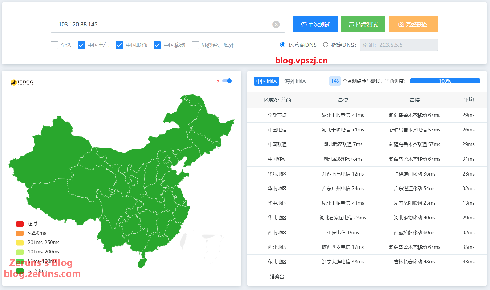 三网平均延迟 29ms,最快湖北十堰电信 1ms。