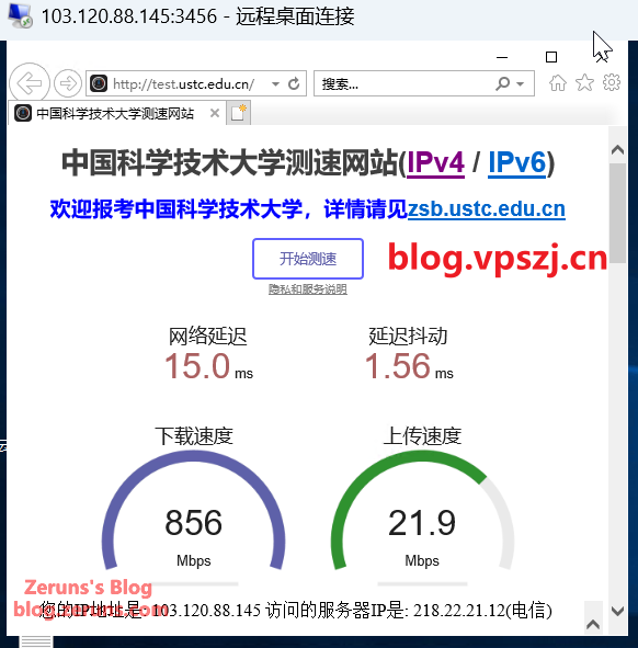 中科大测速站测得:下载速率856Mbps,上传速率21.9Mbps。